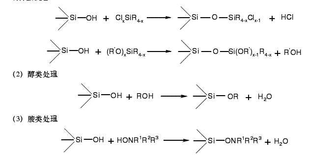 經(jīng)過表面處理后,降低了氣相法白炭黑表面硅羥基數(shù)量,提高了其與有機物的相容性以及分散性,使氣相法白炭黑粉體表面產(chǎn)生新的物理、化學、機械性能。理論上只要能夠與硅羥基反應的物質(zhì)都可以用作氣相法白炭黑的表面處理劑,工業(yè)上常用的是有機硅烷(二甲基二氯硅烷、八甲基環(huán)四硅氧烷、三甲基氯烷,有機硅氧烷、有機硅氮烷和有機鹵硅烷等),胺類化合物和醇類化合物。其原理如下: