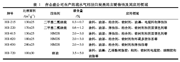 通過碳含量的測定可以定量判斷氣相法白炭黑表面改性效果的好壞。當然,利用不同改性劑處理不同比表面積的氣相法白炭黑,其改性后的碳含量是不同的。表1給出了吉必盛公司生產(chǎn)的改性后的氣相法白炭黑(疏水氣相法白炭黑)的主要物性及其應用領域。