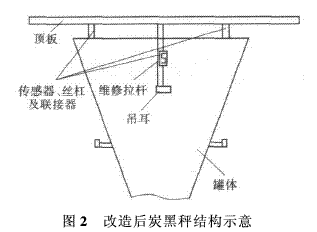 全電子式炭黑秤結(jié)構(gòu)較簡單,沒有復(fù)雜的杠桿結(jié)構(gòu),秤體受力直接作用于傳感器。為保證炭黑秤錐形罐體的平衡,采用3個拉式傳感器吊裝,在保證吊耳水平后只需調(diào)整拉桿高度一致就能保證罐體平衡。焊接作業(yè)時,需取下傳感器,以免被電流擊穿損壞。安裝完畢后,設(shè)置好各項參數(shù),用標(biāo)準(zhǔn)砝碼標(biāo)定零位和滿量程數(shù)值。為保證炭黑秤體因維修等造成偏移后仍能準(zhǔn)確計量,采用絲杠和萬向聯(lián)接器搭配,以避免重心偏移而影響稱量準(zhǔn)確性。