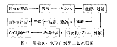 硅灰石屬鈣質(zhì)硅酸鹽礦物,理論化學(xué)組成為CaSiO3。由于其礦物組成簡單、雜質(zhì)少,易溶于無機酸形成酸性硅溶膠,是制備白炭黑的良好硅源。因此用硅灰石制取白炭黑受到廣泛關(guān)注[10-14]。中南冶金地質(zhì)研究所的郭茂生、馮興仁[15]研究了利用硅灰石生產(chǎn)白炭黑的工藝技術(shù),提出以下實用的工藝流程見圖1。經(jīng)檢驗,白炭黑產(chǎn)品能滿足國營中南橡膠集團公司(137廠)的企業(yè)標(biāo)準(zhǔn),達到一級品水平。