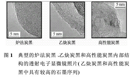 通過熱改性工藝可以控制高性能炭黑的內(nèi)部微結(jié)構(gòu)。高性能炭黑(商品名PureblackCarbon,SCD級)的內(nèi)部微結(jié)構(gòu)與一種典型的爐法炭黑和乙炔炭黑的比較見圖1??梢钥吹?從原生爐法炭黑到高性能炭黑,石墨層有序化程度提高,從而使高性能炭黑的導(dǎo)電、導(dǎo)熱性均優(yōu)于原生爐法炭黑。乙炔炭黑也是部分石墨化的炭黑,另外其純度也較高,所以一般用于導(dǎo)電塑料和電池中。但是,盡管新型高性能炭黑的內(nèi)部微結(jié)構(gòu)與乙炔炭黑的相當(dāng),但其卻更具優(yōu)勢,因為其可制成各種形態(tài)及達到各種石墨化程度,因而可優(yōu)化膠料的加工性能和使用性能。