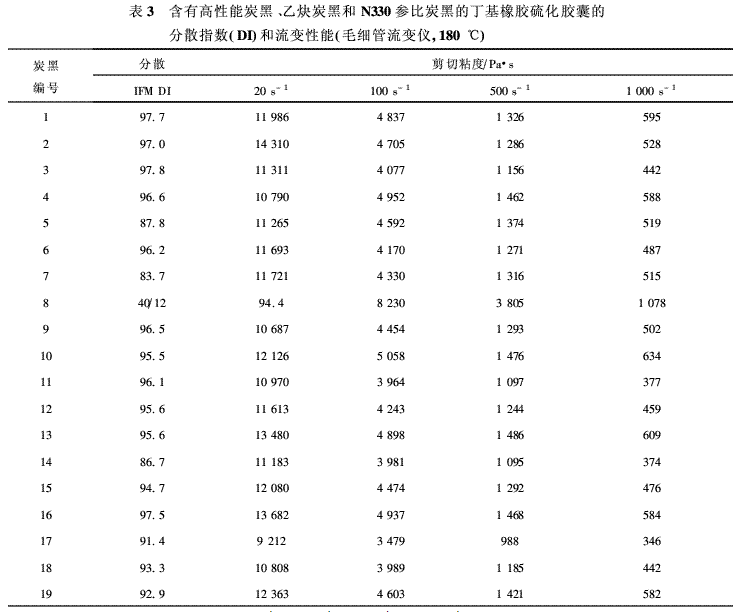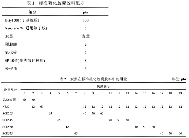 硫化膠囊中常用的炭黑有N300、N220、乙炔炭黑等,以及它們不同比例的并用體。高性能炭黑可替代乙炔炭黑,單獨使用或與N330并用。表2示出了該研究中所用的各種炭黑。