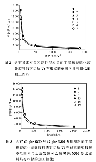 未硫化膠的流變性能用毛細管流變儀在20 s-1、100 s-1、500 s-1和1 000 s-1剪切速率下進行了測定,表3中也列出了剪切粘度數(shù)據(jù)。圖2和圖3示出了參比膠料和各種含SCD級炭黑的膠料的剪切粘度與剪切速率的關(guān)系。從圖上看,很難發(fā)現(xiàn)參比膠料和SCD級炭黑在剪切粘度上有什么差別。但進一步分析表明,總的來說,含SCD的膠料剪切粘度等于或低于3個參比膠料,僅有少數(shù)例外。