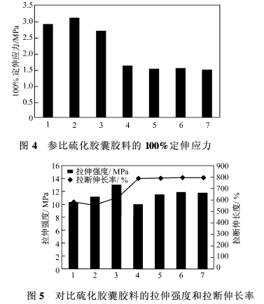圖6和圖7分別示出了高性能炭黑與N330并用填充的膠料與參比膠料的100%定伸應(yīng)力、拉伸強度和拉斷伸長率的對比情況。正如所料,隨SCD用量的增大(N330用量固定在12 phr),定伸應(yīng)力增大。這些膠料的定伸應(yīng)力與含65 phr SCD的膠料很接近,說明12 phrN330提升定伸應(yīng)力的作用有限。由此可見,SCD與N330并用后可以提高膠料的定伸應(yīng)力,同時對硫化膠囊的加工性能和其他重要性能沒有影響。