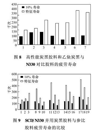 圖9示出了SCD/N330并用填充膠料與參比膠料的疲勞壽命數(shù)據(jù)比較。SCD/N330以40/12并用比填充的膠料,其疲勞壽命優(yōu)于參比較料。其余并用體系膠料的疲勞壽命等同于或低于參比膠料。與所預(yù)期的一樣,隨SCD炭黑用量的增大,疲勞壽命縮短,這一結(jié)果與所觀察到的模量變化相吻合,即隨SCD炭黑用量的增大,模量增大,恒應(yīng)變下的能量輸入增大。還注意到,隨炭黑用量增大,拉伸強度下降。高用量使應(yīng)變幅度增大,從而縮短了疲勞壽命。