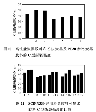 圖10和圖11示出了參比膠料和SCD膠料的C型撕裂強度。由圖可見,總的來說,各種SCD膠料的撕裂強度等同于或低于參比膠料。顯然,對于撕裂強度而言,SCD的惰性表面對這種破壞性能是不利的,會提高引發(fā)裂紋的機率。但也注意到,隨著SCD用量增大,撕裂強度也有所提高(見圖11)。