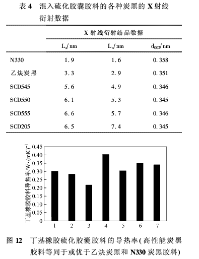 應(yīng)當(dāng)注意到,炭黑形態(tài)的差別可能對導(dǎo)熱性也有影響。但是,也有研究表明,含有從熱裂法到高導(dǎo)電各種炭黑的丁基橡膠膠料,其導(dǎo)熱率差異僅約15%。除了這兩種特種炭黑,ASTM橡膠爐法炭黑之間的導(dǎo)熱率差異更小(約8%)。研究還表明,丁基橡膠硫化膠囊在100℃下的導(dǎo)熱率與膠囊實際使用時的高溫下的導(dǎo)熱率差異很小,甚至無差異。