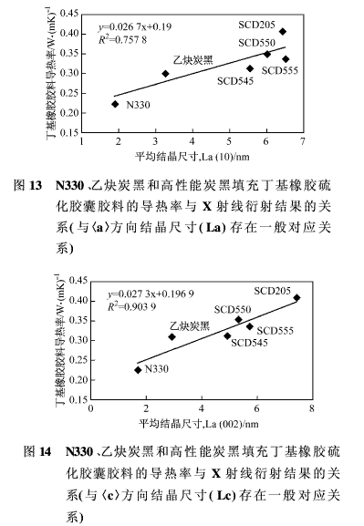 圖13和圖14示出了硫化膠囊膠料的導(dǎo)熱率與各個炭黑X射線衍射性能的關(guān)系(La:平均石墨層尺寸,Lc:平均晶粒堆徹高度),再次證明了炭黑微結(jié)構(gòu)序列與膠料導(dǎo)熱性增加的直接關(guān)系。