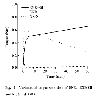 利用橡膠硫化儀對(duì)白炭黑與ENR之間的反應(yīng)溫度進(jìn)行確定[7~9].選取了3種樣品,ENR、填充白炭黑的ENR以及填充白炭黑的NR.圖1是在170℃下60min各體系扭矩隨時(shí)間的變化情況.ENR在整個(gè)過(guò)程中扭矩幅度很小的上升;而白炭黑填充的NR扭矩隨著時(shí)間的延長(zhǎng)逐漸下降,這是因?yàn)镹R本身不能與白炭黑發(fā)生反應(yīng),在高溫下NR迅速降解,所以引起扭矩的下降;白炭黑與ENR混合體系的扭矩逐步增大,體系扭矩的增大一般是因?yàn)榘l(fā)生了某種交聯(lián)反應(yīng).