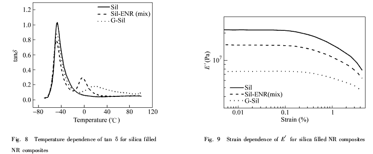 為了進(jìn)一步考察各體系中粒子網(wǎng)絡(luò)化程度的大小,表征接枝白炭黑在NR中分散性的好壞,對(duì)硫化膠進(jìn)行了動(dòng)態(tài)應(yīng)變掃描.圖9是貯能模量E′隨動(dòng)態(tài)應(yīng)變的變化情況,也就是上面所提到的Payne效應(yīng).由圖中可以看出,Payne效應(yīng)強(qiáng)弱的順序依次為,未改性白炭黑>ENR共混改性白炭黑>ENR接枝改性白炭黑.實(shí)驗(yàn)結(jié)果表明,白炭黑經(jīng)ENR接枝改性后,Payne效應(yīng)明顯減弱.說(shuō)明接枝改性白炭黑粒子網(wǎng)絡(luò)化程度最小,分散性最好.綜上所述,通過(guò)在Haake內(nèi)對(duì)白炭黑的接枝改性,環(huán)氧天然橡膠有效包覆在白炭黑表面,接枝到白炭黑上.ENR接枝白炭黑填充的硫化膠復(fù)合材料具有較高的定伸應(yīng)力,白炭黑與橡膠基體間作用明顯增強(qiáng);動(dòng)態(tài)性能測(cè)試結(jié)果表明結(jié)合在白炭黑表面的ENR分子鏈活動(dòng)性降低,其玻璃化轉(zhuǎn)變向高溫偏移,使硫化膠復(fù)合材料在常溫以上的動(dòng)態(tài)滯后明顯增大.Payne效應(yīng)結(jié)果顯示,接枝改性白炭黑在NR中具有良好的分散性,粒子的網(wǎng)絡(luò)化程度降低,粒子間相互作用減弱.