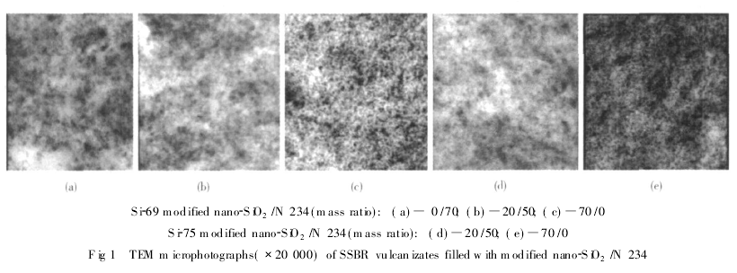 從圖1可以看出,只填充N 234的SSBR硫 化膠,炭黑在膠料中呈珠鏈狀分布,表現(xiàn)出顯著的 填料網(wǎng)絡(luò)特征;只填充改性納米SiO2的膠料,納 米SiO2粒子呈圓球狀均勻分布在SSBR基體中;而填充改性納米SiO2/N 234(質(zhì)量比為20/50)膠 料的情形,其珠鏈網(wǎng)絡(luò)中鑲嵌著圓球狀的改性納 米SiO2,說明反應(yīng)共混改性已將納米SiO2連接于橡膠大分子鏈上,再混入與橡膠親和性優(yōu)異的炭 黑時,形成的炭黑-橡膠膠團(tuán)中就鑲嵌有分散性 好的納米SiO2顆粒。比較而言, 2種偶聯(lián)劑改性 的納米SiO2粉體分散狀態(tài)相差不大,但Si-75改性納米SiO2粉體的粒徑較小。