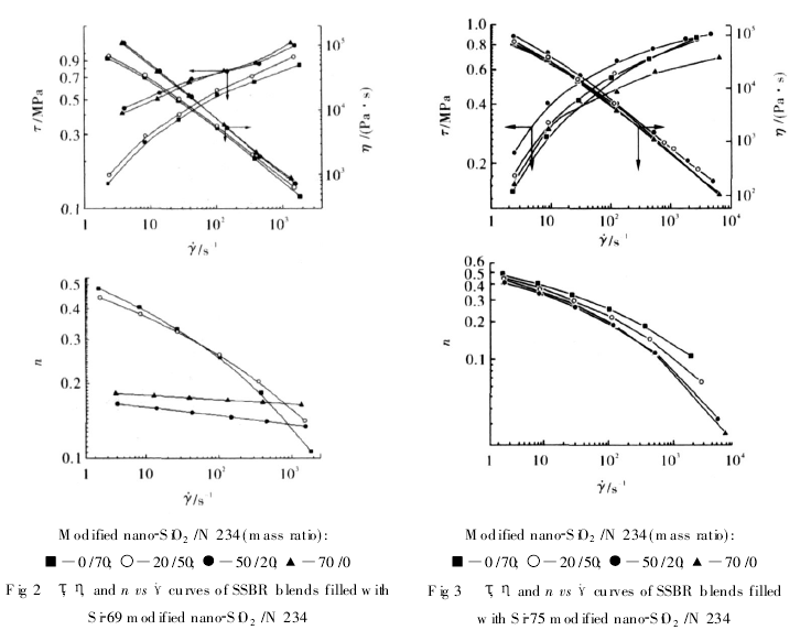 圖2和圖3中的η、.γ、τ和n分別表示表觀黏 度、剪切速率、剪切應(yīng)力和牛頓指數(shù)。由圖2可 知, Si-69改性納米SiO2/N 234(質(zhì)量比,下同) 填充膠料的表觀黏度隨改性納米SiO2用量的增加而增大,當(dāng)質(zhì)量比超過20/50時,膠料的擠出表 觀較差,呈現(xiàn)香腸狀的畸變,這可能是高溫原位反 應(yīng)共混過程中,硅烷偶聯(lián)劑中釋放出部分硫原子, 使橡膠分子鏈發(fā)生部分交聯(lián)之故。