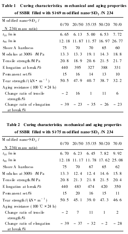 從表1和表2可以看出,隨著改性納米SiO2/ N 234質(zhì)量比的增加, SSBR硫化膠的焦燒時間 (t10)變化不大,t90增加,硫化速率減慢,體現(xiàn)了延 遲硫化的特點。此外,隨著改性納米SiO2/N234 質(zhì)量比的增加,膠料的邵爾A硬度、扯斷伸長率、 永久變形、撕裂強度下降, 300%定伸應(yīng)力顯著提 高,拉伸強度則變化不大??赡苁请S著改性納米 SiO2用量的增大,硅烷偶聯(lián)劑的量也隨之增大,從而更能體現(xiàn)出偶聯(lián)劑的結(jié)構(gòu)特性及優(yōu)勢。相比 較而言,盡管Si-75改性納米SiO2/N 234填充的 膠料的定伸應(yīng)力低于Si-69,拉伸強度相差不大, 但當(dāng)改性納米SiO2所占比例較大時,前者的撕裂強度較高,耐老化性能也較好。