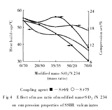 由圖4可知,隨著改性納米SiO2/N 234質(zhì)量 比的增加, SSBR硫化膠的壓縮生熱及壓縮永久變 形降低,以Si-69為偶聯(lián)劑的膠料其總的下降幅 度大于Si-75。這是因為采用等摩爾Si-69或Si-75改性納米SiO2, Si-69為四硫化物,在高 溫下形成了單硫、二硫或多硫自由基的端基,與橡 膠大分子發(fā)生接枝反應(yīng)或誘發(fā)大分子鏈產(chǎn)生硫硫 鍵交聯(lián),從而增大了膠料的交聯(lián)密度;而Si-75為二硫化物,其硫原子少,斷裂產(chǎn)生的單硫自由基 則直接鍵合在橡膠大分子上。