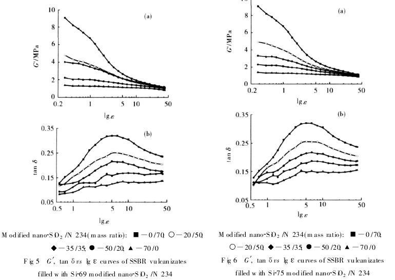 從圖5 (a)、圖6 (a)可以看出,隨著改性 SiO2/N 234質(zhì)量比增大, SSBR硫化膠的G′均隨 應(yīng)變的增大而逐漸減小,即ΔG′逐漸減小至 趨于0,說明Payne效應(yīng)逐漸減小,改性SiO2/N 234在SSBR中的分散性逐漸變好,填料與橡膠 基體的結(jié)合作用變強。相比較而言, Si-75改性 納米SiO2對膠料性能的影響比Si-69更具規(guī)律 性。另外從圖5(b)、圖6(b)可以看出,改性納米SiO2/N 234填充的SSBR硫化膠在lgε為7左右 時獲得最大的tanδ。隨著改性納米SiO2用量的 增加, tanδ降低,當(dāng)填料全部為改性納米SiO2時,tanδ最低,且tanδ在實驗的應(yīng)變范圍內(nèi)幾乎保 持恒定。表明反應(yīng)共混改性方法可減少填料網(wǎng) 絡(luò),使納米SiO2達(dá)到最佳分散狀態(tài)。