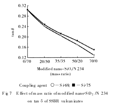 圖7表明, Si-69改性納米SiO2/N 234填充 SSBR硫化膠的tanδ低于Si-75改性納米SiO2/ N 234,說明前者的損耗模量與G′比值較小,從而在發(fā)生動態(tài)應(yīng)變時用于轉(zhuǎn)化為熱量的能量較少, 生熱也較低。這是因為2種偶聯(lián)劑所含硫原子不 同導(dǎo)致膠料的交聯(lián)密度不同所致。