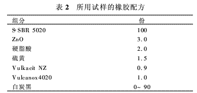 供研究的試樣是由德國(guó)Bayer AG公司提供的。這些試樣的形式為圓形薄片,厚度不超過1.5mm,直徑為2cm。試樣的橡膠配方列于表2。