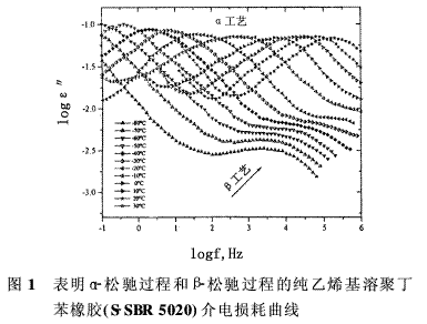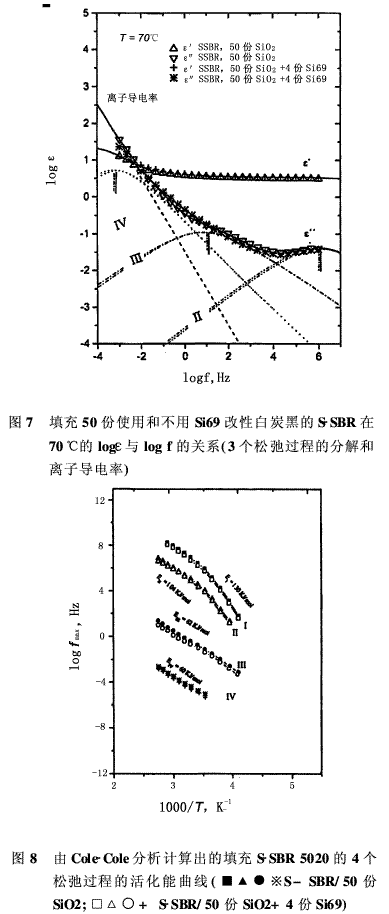 因此,基于前述的NMR研究,我們可以把高頻端的過程(Ⅰ)歸結(jié)于結(jié)合松散、活動(dòng)度高的橡膠相,這樣的橡膠相距離白炭黑-橡膠界面很遠(yuǎn);而把過程(Ⅱ)歸結(jié)于活動(dòng)度較低的橡膠鏈,后者與白炭黑表面結(jié)合得很緊。