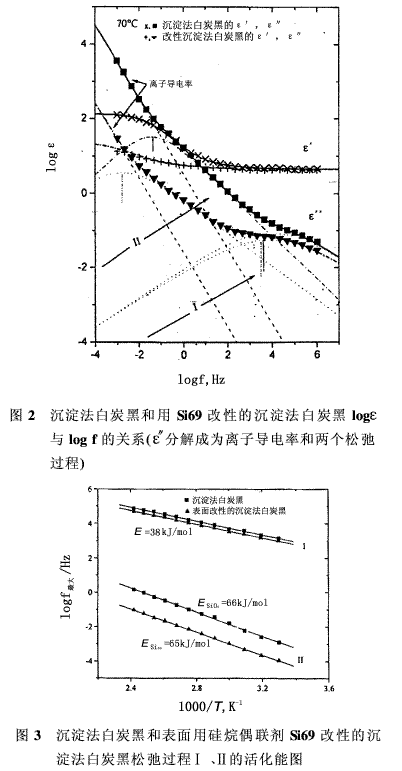 考察了填料(沉淀法白炭黑)在用硅烷偶聯(lián)劑(Si69)改性前后的電容率ε′和介電損耗ε″。在10-3~10-6Hz頻率范圍和30~140℃的溫度范圍內(nèi)測(cè)定了ε′和ε″。圖2繪出了70℃時(shí)白炭黑未添加Si69以及添加了Si69的結(jié)果(logε和logf)的例子。吸收曲線十分寬闊,表明了松弛時(shí)間的分布。利用基于疊加Cole-Cole法的計(jì)算機(jī)程序?qū)?shù)據(jù)進(jìn)行分析。除了導(dǎo)電率貢獻(xiàn)之外還獲得了兩個(gè)吸收區(qū)。對(duì)于未改性的白炭黑,注意到第一個(gè)吸收區(qū)(Ⅰ)的峰值在104Hz附近,并且由于改性引起的位置和高度變化相對(duì)較小。該吸收區(qū)可能起因于白炭黑上吸附的水分,這與文獻(xiàn)中Korbatof的見解相吻合。隨著溫度的升高,這一峰值移至更高的頻率。圖3示出最大頻率fmax隨溫度變化的情況,并計(jì)算出了活化能,發(fā)現(xiàn)其值為38 kJ/mol———這與Lange發(fā)現(xiàn)的白炭黑凝膠上吸附水分的活化能(31.5~42 kJ/mol)差不多。圖3示出的未改性白炭黑的第二個(gè)吸收區(qū)(Ⅱ)其峰值位于0.1Hz附近。我們還注意到,ε′在頻率最低處是恒定不變的。我們?cè)谠缦鹊囊黄撐闹?利用導(dǎo)電松弛模型解釋了這一行為,并得出了離子的擴(kuò)散性遷移在低頻率區(qū)是占支配性的機(jī)理這一結(jié)論。通過用Si69改性,這個(gè)峰遷移到了頻率更低的區(qū)域,其強(qiáng)度和ε′的減小相當(dāng)引人注目。這樣的遷移可能歸因于在相鄰的Si69分子間形成了硅烷鍵,導(dǎo)致OH基減少,進(jìn)而引起電荷載體減少,使得強(qiáng)度和ε′均降低了。這第二個(gè)過程的活化能等于65 kJ/mol。