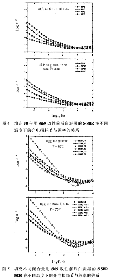 我們還注意到,白炭黑的改性并不會(huì)對(duì)S-SBR的松弛行為有太多的影響。這可能是由于S-SBR與白炭黑(即便在改性前)良好的混合能力使然。因此,對(duì)于S-SBR沒有必要使用改性白炭黑。推薦使用的白炭黑配合量宜低于滲透閾(50份白炭黑),因?yàn)樵谶_(dá)到這一配合量后介電損耗將會(huì)增大。
