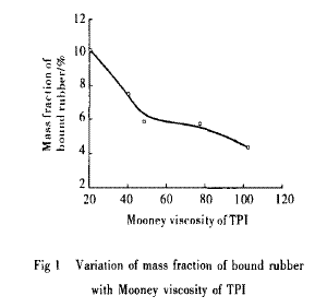 由圖I可以看出,隨TPI門尼黏度增大,炭黑結(jié)合膠含量降低。其原因首先是由于門尼薪度小的TPI塑化膠更容易使炭黑混人且分散均勻;其次是在共混過程中門尼鉆度小的聚合物分子鏈較短,末端基數(shù)量較多,易與炭黑發(fā)生化學(xué)結(jié)合。