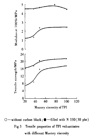 2. 3炭黑對(duì)不同門尼黏度TPI硫化膠物理機(jī)械性能的影響