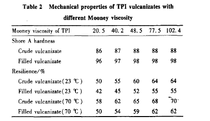 由表2可以看出,加人炭黑后TPI硫化膠的邵爾A硬度增大,且隨TPI門尼黏度的增加而增大,當(dāng)TPI門尼黏度達(dá)到一定值(約48)后不再變化?;貜椥砸嚯STPI門尼黏度的增加而增大,填充炭黑后回彈性降低。