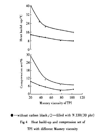 從圖4還可看出,隨門尼黏度增加,TPI硫化膠的壓縮永久變形減小,填充炭黑后這種變化更明顯。即隨著TPI相對(duì)分子質(zhì)量的增加,其分子鏈末端減少,TPI硫化膠的彈性增大,壓縮永久變形減小。而炭黑的加人使硫化膠的滯后性增加,變形恢復(fù)能力減弱,且增強(qiáng)作用越明顯則滯后性越大,變形恢復(fù)能力就越弱,說明炭黑對(duì)低門尼黏度TPI的增強(qiáng)作用更好,因此其滯后性更大,壓縮永久變形能力也較高門尼黏度者增大許多。