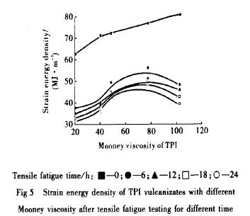 在拉伸比為1時(shí),對(duì)不同門尼黏度的TPI硫化膠試樣拉伸疲勞一定時(shí)間后,分別測(cè)其拉伸強(qiáng)度,對(duì)拉伸一形變曲線積分可得其拉伸形變能密度。由圖5可以看出,未疲勞試樣的拉伸形變能密度隨門尼黏度的增大而增大。拉伸疲勞后門尼黏度為80左右時(shí),TPI硫化膠的拉伸形變能密度最大。這是由于試樣疲勞后其結(jié)晶被破壞,試樣內(nèi)部開始產(chǎn)生缺陷或裂紋,且結(jié)晶度越高這種因疲勞產(chǎn)生的裂紋就越明顯,疲勞后就越容易發(fā)生斷裂,其強(qiáng)度和扯斷伸長率都會(huì)降低,而TPI的結(jié)晶度是隨其相對(duì)分子質(zhì)量的增大而增大的。由于門尼豁度低的TPI硫化膠試樣含有大量鏈段末端,本身就存在很多缺陷,所以拉伸形變能密度很低。