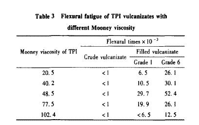 d)生膠門尼黏度為50一80的TPI硫化膠的耐動(dòng)態(tài)疲勞性能較好。