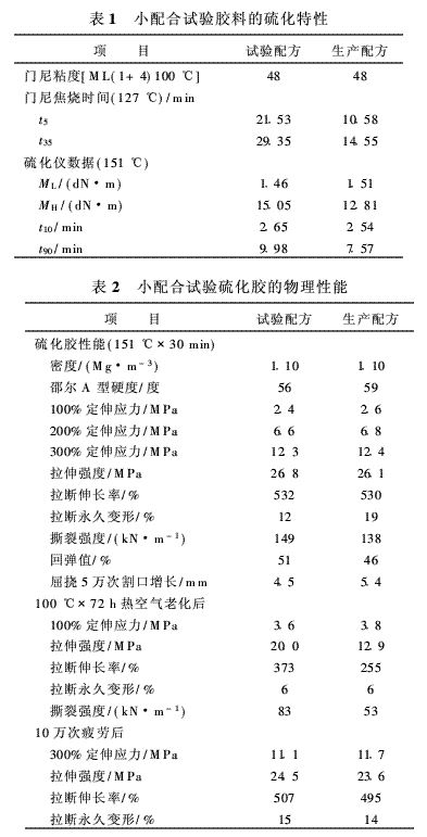 生產(chǎn)配方為:NR 100,炭黑N375/N660 45,活性劑 6·5,防老劑4020 1·2,防老劑TMQ 0·5,促進劑NOBS 0·7,促進劑CZ 0·7,不溶性硫黃 1·47,其它 5。試驗配方為:NR 100,炭黑N375/N660 37·5,白炭黑 4,活性劑 5,防老劑4020 1·7,防老劑TMQ 0·6,炭黑分散劑 1·5,促進劑NOBS 1·65,不溶性硫黃 1·675。