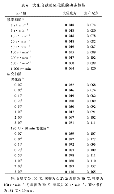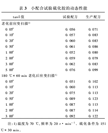 小配合試驗結(jié)果見表1~3。從表1~3可以看出,與生產(chǎn)配方相比,試驗配方膠料的門尼焦燒時間明顯延長,加工安全性提高;硫化膠的撕裂強度和回彈值明顯增大;經(jīng)熱空氣老化和10萬次疲勞后硫化膠仍能保持較高的物理性能;硫化膠的損耗因子(tanδ)明顯減小,說明膠料的動態(tài)生熱下降。胎肩墊膠處于絕氧狀態(tài),絕氧老化后試驗配方硫化膠的tanδ值比生產(chǎn)配方低,說明試驗配方膠料仍能保持較好的物理性能和低生熱。