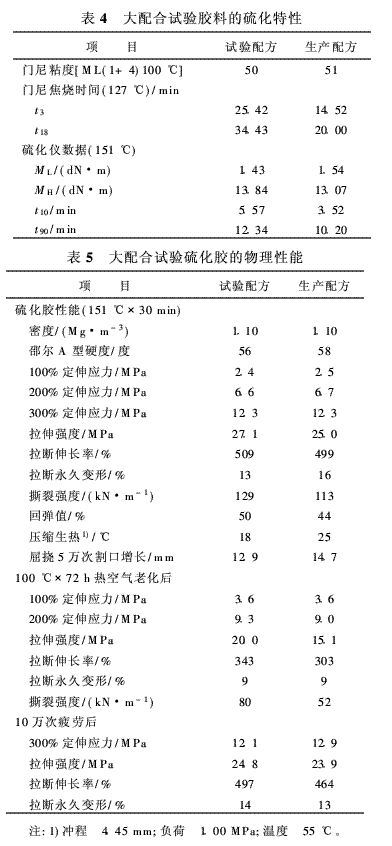 從表4~6可以看出,大配合試驗結(jié)果與小配合試驗結(jié)果基本一致。采用試驗配方可以提高硫化膠的抗撕裂性能和彈性,降低動態(tài)生熱,達到了設(shè)計的預(yù)期要求。