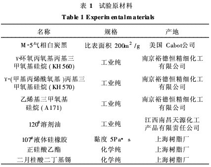 氣相白炭黑經(jīng)硅烷偶聯(lián)劑處理后,在高速攪拌機(jī)作用下加入到107#液體硅橡膠中,得到補(bǔ)強(qiáng)的混合膠液?;旌夏z加入交聯(lián)劑正硅酸乙酯、催化劑二月桂酸二丁基錫,室溫下攪拌使其硫化,抽真空制作試樣。