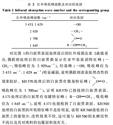 1)紅外測(cè)試結(jié)果表明,偶聯(lián)劑處理白炭黑都能使白炭黑表面接枝上偶聯(lián)劑基團(tuán)。疏水率測(cè)試結(jié)果表明,A171處理白炭黑效果最好。