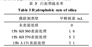 不同偶聯(lián)劑處理后白炭黑的疏水性測(cè)試結(jié)果見表3。