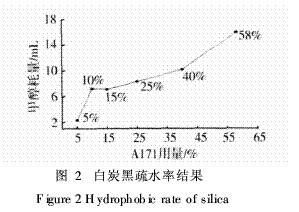 采用A171為處理劑,研究不同用量A171對(duì)白炭黑疏水性的影響,結(jié)果如圖2。