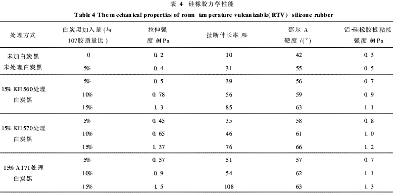 由表4可知,加入白炭黑后,硅橡膠力學(xué)強(qiáng)度明顯提高。加入表面處理后的白炭黑的室溫硫化硅橡膠的拉伸強(qiáng)度、扯斷伸長(zhǎng)率、硬度等力學(xué)性能均有較大幅提高。拉伸強(qiáng)度和扯斷伸長(zhǎng)率隨處理后的白炭黑的加入量增加而增大,說明偶聯(lián)劑處理后白炭黑的補(bǔ)強(qiáng)效果好。其中加入A171處理后的白炭黑的室溫硫化硅橡膠的力學(xué)性能最好,這與前述的疏水性能的結(jié)果比較吻合,說明A171處理后的白炭黑與液體硅橡膠107膠的相容性最好。加入15%A171處理的白炭黑用量15%的RTV硅橡膠硫化后拉伸強(qiáng)度最大能達(dá)到1. 5MPa,由其配制的膠粘劑對(duì)金屬與硅橡膠板的粘接強(qiáng)度達(dá)到1. 3MPa。
