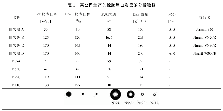 表1是某公司生產(chǎn)的具有代表性的橡膠用 白炭黑分析數(shù)據(jù)。為了進(jìn)行對(duì)比,還把炭黑的 若干個(gè)ASTM數(shù)據(jù)一并列出。