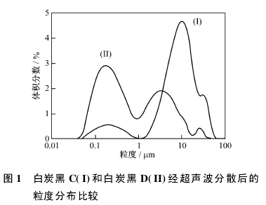 由于二氧化硅表面的高極性及與氫鍵的成 鍵能力,白炭黑聚集體能形成附聚物。在混煉 中由于剪切力作用產(chǎn)生的白炭黑的分散性,可 根據(jù)超聲波處理附聚物的易碎程度進(jìn)行推斷。對(duì)水溶液中的白炭黑進(jìn)行超聲波分散后,可借 助激光繞射測定粒度分布。結(jié)果如圖1所示。 由圖可見,與白炭黑C相比,作為高分散性白 炭黑的白炭黑D的小粒徑聚集體數(shù)量有大幅度增加。結(jié)果表明,白炭黑D有優(yōu)良的分散 性。