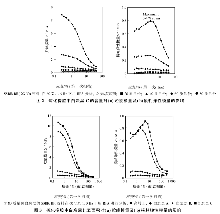 將白炭黑加入到橡膠中,通過二氧化硅網(wǎng) 狀結(jié)構(gòu)的形成,可以使粘度、硬度及模量得到提 高。動(dòng)態(tài)彈性模量與形變的相關(guān)性可以以 Payne效應(yīng)的形式表現(xiàn)出來。在低變形領(lǐng)域,白炭黑網(wǎng)狀結(jié)構(gòu)可以產(chǎn)生高動(dòng)態(tài)彈性模量,但隨 著變形的增加,網(wǎng)狀結(jié)構(gòu)被破壞,動(dòng)態(tài)粘彈性模 量會(huì)大幅降低。利用橡膠加工分析儀(RPA)獲得的膠料中 白炭黑C的含量與貯能模量,以及損耗彈性模 量的關(guān)系,見圖2所示。由圖可見,隨著白炭黑 含量的增加,Payne效應(yīng)會(huì)增大。另外,白炭黑的比表面積也能對(duì)二氧化硅網(wǎng)狀結(jié)構(gòu)的形成產(chǎn) 生很大的影響(見圖3)。在比表面積增加的同 時(shí),聚集體間的距離變短,這時(shí),會(huì)形成更多的 網(wǎng)狀結(jié)構(gòu),Payne效應(yīng)就會(huì)變大。