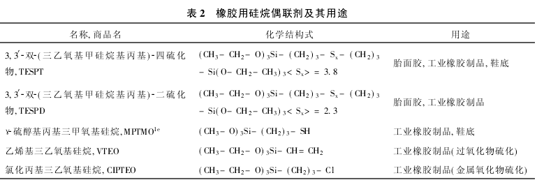 在橡膠行業(yè)中,根據(jù)用途不同,可使用各種 硅烷偶聯(lián)劑。最常見的橡膠用硅烷偶聯(lián)劑如表 2所列。含有硫黃官能團(tuán)的硅烷偶聯(lián)劑可用作 硫黃交聯(lián)。含有乙烯基的硅烷偶聯(lián)劑可用于過氧化物交聯(lián)。