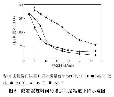 在橡膠母膠中有水分存在的情況下,分子 間縮合會(huì)發(fā)生生成聚硅氧烷的副反應(yīng)中,所生 成的聚硅氧烷在橡膠中的活動(dòng)性差,結(jié)果就有 可能使硅烷化的反應(yīng)效率降低。一旦混煉溫度過高,硅烷化反應(yīng)就有可能 以比白炭黑分散還要快的速度進(jìn)行下去,這將 導(dǎo)致硅烷化處理不均勻,其結(jié)果會(huì)使二氧化硅 網(wǎng)狀結(jié)構(gòu)增加,隨之而來的是補(bǔ)強(qiáng)性降低?;鞜捴械墓柰榛磻?yīng)的進(jìn)行狀況,可以根 據(jù)混煉時(shí)產(chǎn)生的Payne效應(yīng),或者用降低門尼 粘度的辦法進(jìn)行監(jiān)控。如圖6所示,在120℃ 下,反應(yīng)速度較為遲緩,經(jīng)過15min后還是沒 有完成。在145℃下硅烷化處理的速度提高, 在7~8 min之后基本上就完成了。若在165℃ 下反應(yīng)速度更快了。門尼粘度在達(dá)到145℃時(shí) 仍未見到下降,這表明,硅烷化處理反應(yīng)有可能是不均勻的。