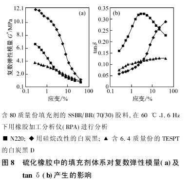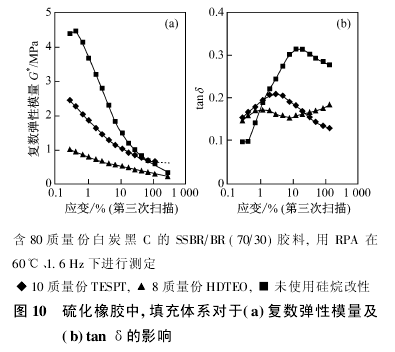 在加入炭黑時(shí),這種固定化主要是通過橡 膠強(qiáng)有力的物理吸附起作用的,而在白炭黑-硅 烷填充劑體系中,白炭黑和橡膠的相互作用比 較弱,所以,就借助于化學(xué)鍵使橡膠固定在白炭黑的表面及白炭黑結(jié)構(gòu)中。這種“化學(xué)性的”固 定會(huì)造成動(dòng)態(tài)彈性模量大幅上升。在硫化時(shí), 依靠白炭黑與橡膠的結(jié)合,橡膠內(nèi)結(jié)構(gòu)和橡膠 自身的網(wǎng)絡(luò)這兩種網(wǎng)絡(luò)結(jié)構(gòu)形成。白炭黑的網(wǎng)狀結(jié)構(gòu)本身的模量也會(huì)產(chǎn)生影 響(圖7)。和其它因素不同,這種網(wǎng)狀結(jié)構(gòu)與 強(qiáng)烈變形存在著相關(guān)性。由于應(yīng)變破壞了網(wǎng)狀 結(jié)構(gòu),于是便發(fā)生了滯后損失。圖8是復(fù)數(shù)彈性模量和損耗因子tanδ與應(yīng)變的相互關(guān)系示 意圖。從圖8可以看出,假如把白炭黑D和 TESPT配合使用的話,其Payne效應(yīng)和tanδ就 比單獨(dú)使用炭黑與白炭黑D的要小。究其原因,白炭黑與橡膠的互相作用較小,發(fā)生化學(xué)固 定的橡膠,即便是在高應(yīng)變范圍內(nèi)也是非常穩(wěn) 定的,而且白炭黑網(wǎng)狀結(jié)構(gòu)由于硅烷化反應(yīng)還 出現(xiàn)了大幅減少的現(xiàn)象。