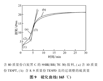 TESPD及TESPT在硫化中基本上是起著硫 黃接受體的作用。只有長鏈的多硫化物在硫化 中才能成為給予體。在使用純二硫化物硅烷的 情況(例如,TMTM之類的硫化促進(jìn)劑)下,如果不增加硫黃量,交聯(lián)反應(yīng)就不能進(jìn)行。含TESPT膠料及含TESPD膠料的硫化曲 線如圖9所示。在測定開始時(shí),無論使用哪一 種硅烷,都可以看出,隨著白炭黑發(fā)生再凝聚, 扭矩值會(huì)有一定的升高[1]。TESPT的初始扭矩值升高要比TESPD的要大些(z)。這是由 TESPT中的多硫化物引起的。在用硫化促進(jìn)劑 活化之后,母膠的交聯(lián)和白炭黑-橡膠偶合就同 時(shí)發(fā)生了(3)。TESPD的耐焦燒穩(wěn)定性高,硫化速度快,在混煉時(shí),其耐早期焦燒性成為TESPD 在加工方面一個(gè)十分突出的優(yōu)點(diǎn)。