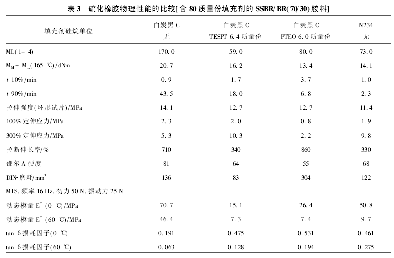 如表3所示,與使用未經(jīng)過處理的白炭黑 及白炭黑與丙基三乙氧基硅烷PTEO的組合那 樣,不存在硅烷/橡膠鍵的情況相比,白炭黑和 TESPT的組合可使模量以及耐磨耗性得到大幅改善,這種膠料的補(bǔ)強(qiáng)性超過同樣使用炭黑 N234的膠料,并且還能使tanδ降低。