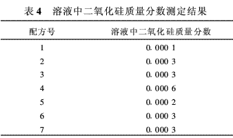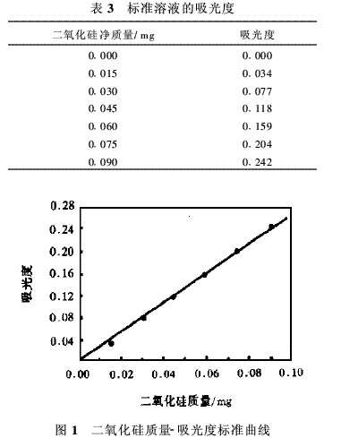 極少量在酸溶液中形成可溶性膠體進(jìn)入濾液中的二氧化硅,用硅鉬藍(lán)光度法測定。所配標(biāo)準(zhǔn)溶液的濃度及吸光度見表3,標(biāo)準(zhǔn)曲線見圖1。所下配方中以可溶性硅酸形式進(jìn)入濾液中的二氧化硅測定結(jié)果見表4。