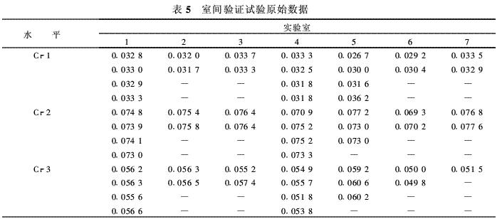 按GB 6379—86中規(guī)定的科克倫檢驗法檢驗單元方差,發(fā)現(xiàn)Cr-1水平第5實驗室的單元方差為高度異常值,故決定剔除,并相應(yīng)地剔除該單元平均值,在此后的檢驗與計算中均不計入。