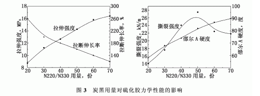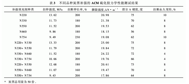 (2)使用炭黑N220和N330并用補(bǔ)強(qiáng)ACM,用量在25份/25份時(shí),硫化膠具有良好的物理機(jī)械性能。