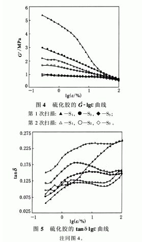 圖4和5示出了S1,S2和S3硫化膠的應(yīng)變掃描結(jié)果(相同條件下對試樣進(jìn)行兩次連續(xù)掃描)。